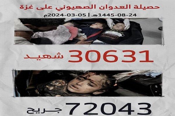 وزارت بهداشت غزه اعلام کرد که بر اثر حمله های رژیم صهیونیستی به غزه تاکنون ۳۰ هزار ۶۳۱ نفر شهید و ۷۲ هزار و ۴۳ نفر زخمی شده اند.