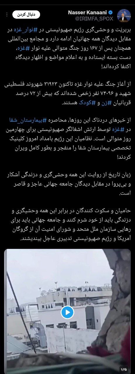 به گزارش شباب پرس، ناصر کنعانی سخنگوی وزارت امور خارجه امروز (پنجشنبه) دوم فروردین ماه با اشاره به اوضاع جاری در غزه و همچنین محاصره بیمارستان شفا در شبکه اجتماعی ایکس نوشت: بربریت و وحشی‌گری رژیم صهیونیستی در نوار غزه در مقابل دیدگان همه جهانیان ادامه دارد و مجامع بین‌المللی همچنان پس از ۱۶۷ روز جنگ متوالی علیه نوار غزه، دست بسته ایستاده و به اعلام مواضع و اظهار دیدگاه اکتفا کرده‌اند.