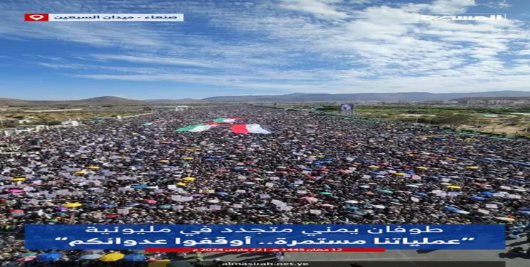 ميليونها نفر از مردم استانهای مختلف یمن امروز جمعه به خیابانها آمدند و ضمن اعلام حمایت قاطع از ملت فلسطین، تأکید کردند که نیروهای مسلح این کشور باید دامنه عملیاتهای ضد صهیونیستی خود را افزایش دهد.