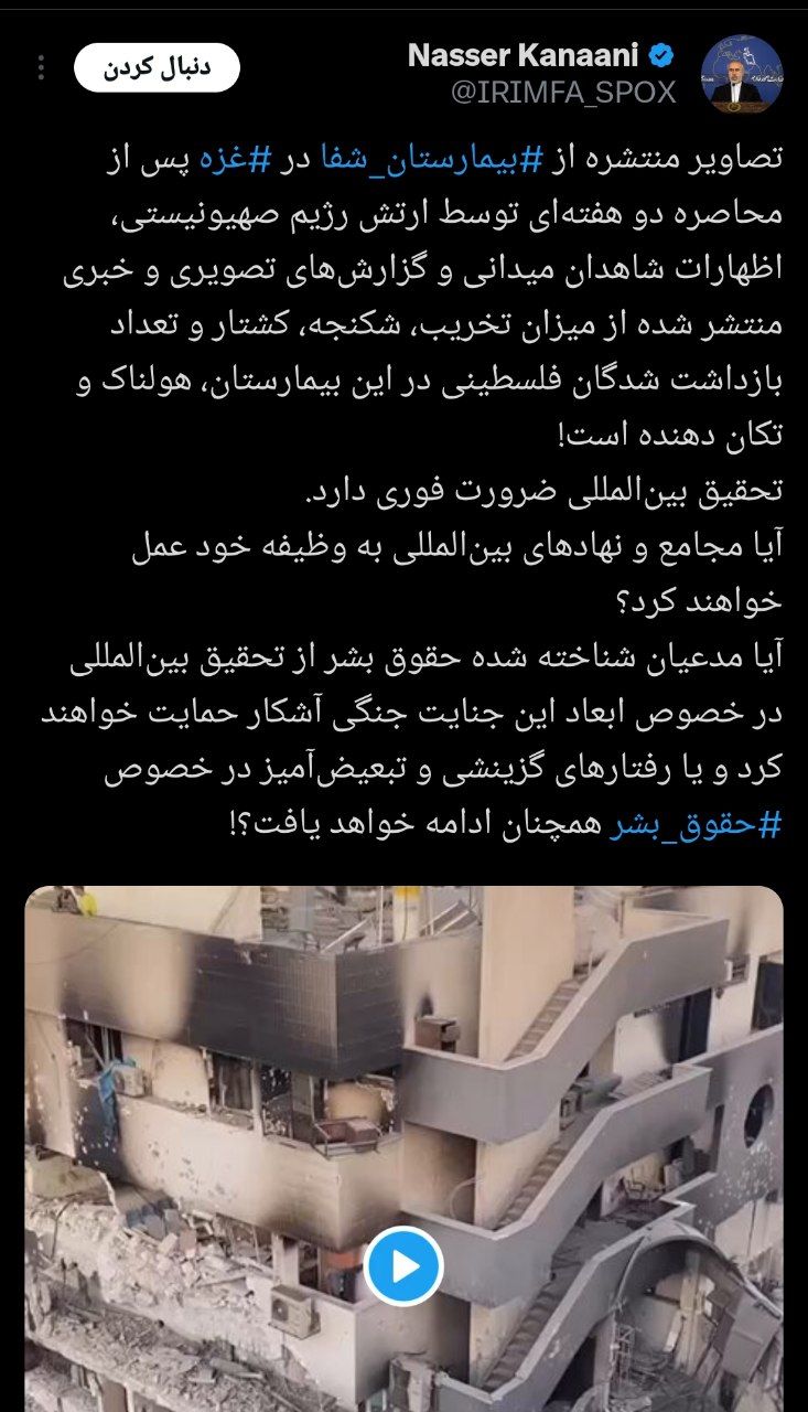 به گزارش شباب پرس، ناصر کنعانی سخنگوی وزارت امور خارجه امروز (دوشنبه) ۱۳ فروردین در شبکه اجتماعی ایکس نوشت: تصاویر منتشره از بیمارستان شفا در غزه پس از محاصره دو هفتهای توسط ارتش رژیم صهیونیستی، اظهارات شاهدان میدانی و گزارشهای تصویری و خبری منتشر شده از میزان تخریب، شکنجه، کشتار و تعداد بازداشت شدگان فلسطینی در این بیمارستان، هولناک و تکان دهنده است.