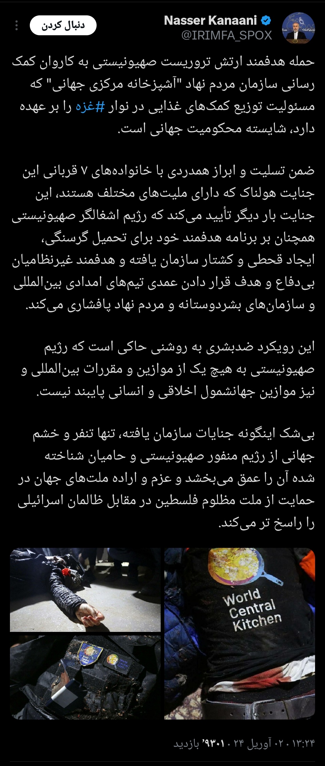 به گزارش شباب پرس، ناصر کنعانی سخنگوی وزارت امور خارجه امروز (سهشنبه) ۱۴ فروردین ماه عنوان کرد: حمله هدفمند ارتش تروریست صهیونیستی به کاروان کمک رسانی سازمان مردم نهاد «آشپزخانه مرکزی جهانی» که مسئولیت توزیع کمکهای غذایی در نوار غزه را بر عهده دارد، شایسته محکومیت جهانی است.