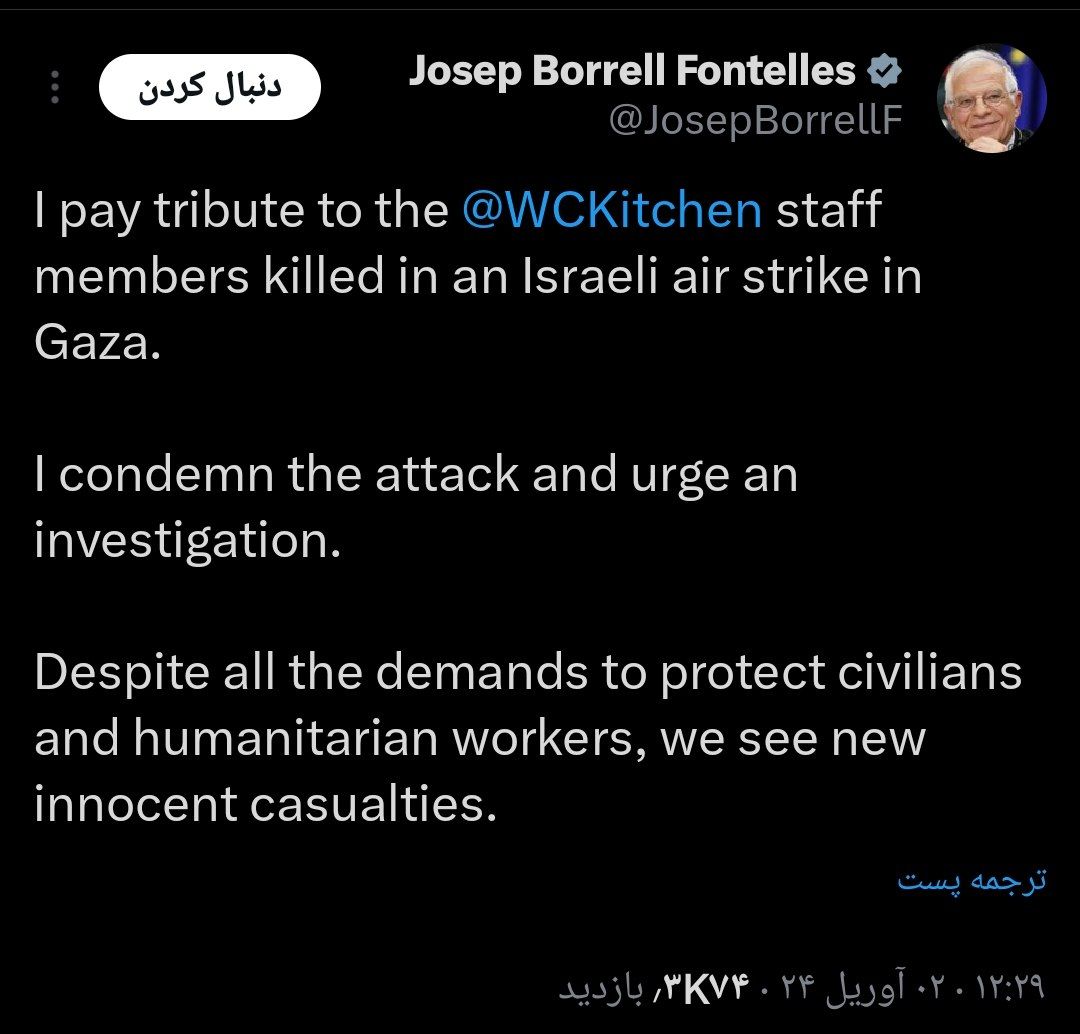 به گزارش شباب پرس، «علیرغم تمام درخواست‌ها برای حفاظت از غیرنظامیان و کارکنان بشردوستانه، شاهد تلفات جدید افراد بیگناه هستیم» این اظهارات جوزپ بورل مسئول سیاست خارجی اتحادیه اروپا در واکنش به حمله صبح امروز ارتش رژیم صهیونیستی در غزه به کاروان خودروهای «آشپزخانه مرکزی جهانی» است که هفت نفر از کارکنان غیرفلسطینی این سازمان را قربانی کرد.