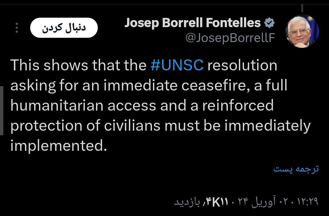 بورل در رشته پیامی که امروز در شبکه اجتماعی ایکس منتشر کرد، ضمن محکومیت حمله رژیم صهیونیستی و درخواست برای تحقیقات در خصوص این حمله، افزود «این نشان می‌دهد که قطعنامه شورای امنیت سازمان ملل که خواستار آتش‌بس فوری، دسترسی کامل بشردوستانه و تشدید حفاظت از غیرنظامیان (در غزه) است، باید فوراً اجرا شود».